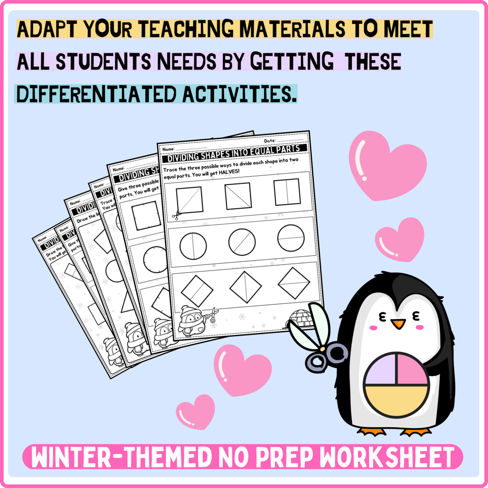 A fun, simple way to practice the" Divide shapes into equal parts " lesson on fractions using winter-themed differentiated activities.