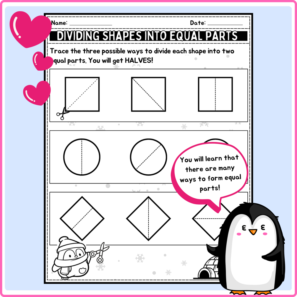 A fun, simple way to practice the" Divide shapes into equal parts " lesson on fractions using winter-themed differentiated activities. The concept of "equal parts" can be critical for kids as fractions can only be used to represent shapes that are divided into equal parts. In these worksheets, students will draw lines to divide shapes into two, three, and four equal parts.